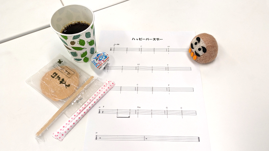 今回はソロ弾きで「かえるのうた」、コード弾きで「ハッピーバースデー」にチャレンジしました。